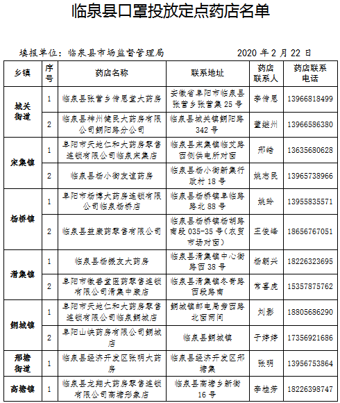 各乡镇(街道)根据实际人口基数,除城关街道、滑集镇、鲖城镇、宋集镇、杨桥镇选择2家定点药房外,其余23个乡镇(街道)选择1家具有良好信誉、熟悉操作流程的药店服务人员作为群众线下购买民用防护口罩的定点药店,共计33个线下购买定点零售药店。