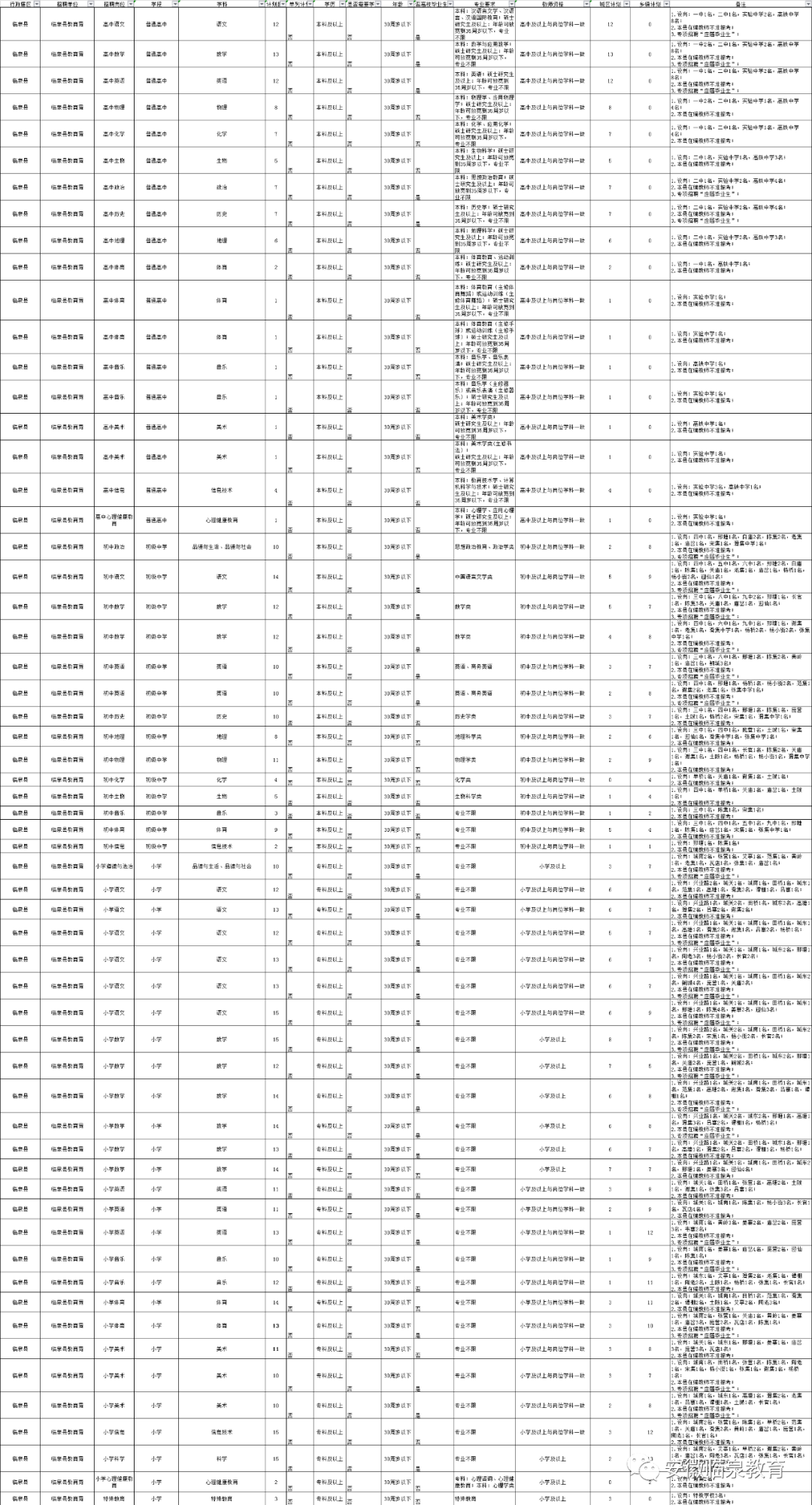 2020年度临泉县中小学新任教师招聘岗位计划