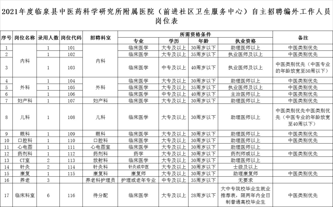 附件1:2021年度临泉县中医药科学研究所附属医院(前进社区卫生服务中心)自主招聘编外工作人员岗位表